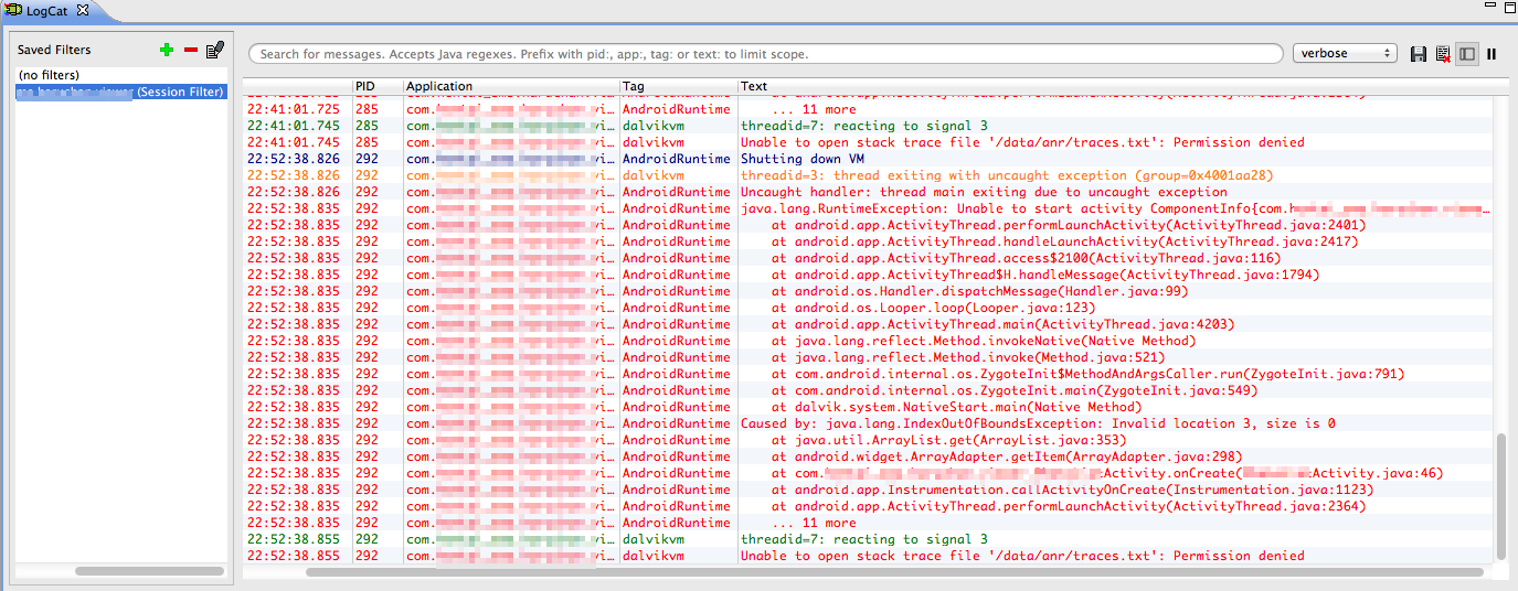 余談ですが、最近のLogCatはよく出来てて、予期せぬエラーで止まった場合(Catchしてない例外が発生した場合)は自動でSession Filter(自分のアプリに関係あるログだけフィルタリングしてくれる)が追加されるから、昔みたいに手動でフィルタかける必要がなくて楽
