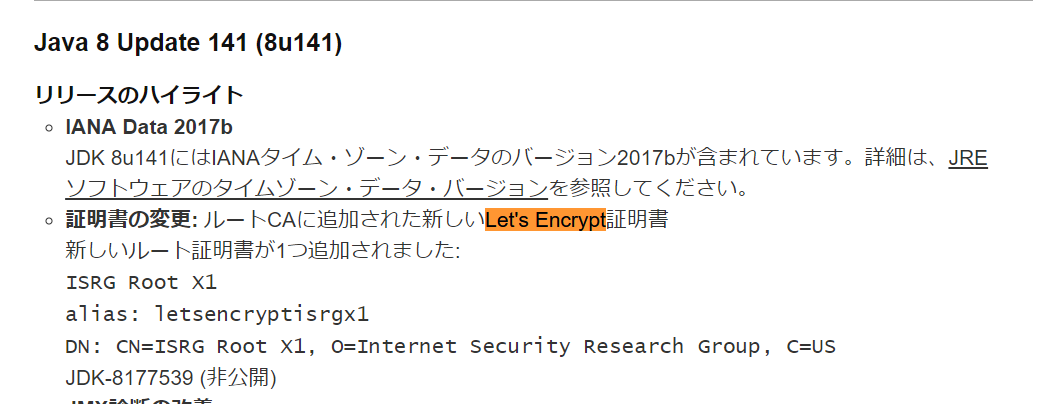 調べたところ、Javaのリリースノートに「Java 8 Update 141(8u141)でLet's Encryptの証明書が追加された」という記述を見つけました。