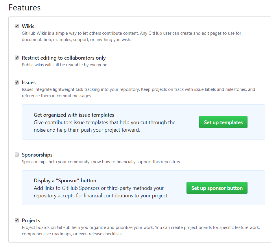 ここまでできたらついでにIssue Templateの設定もしておくとIssue登録する際に「アレ?AutolinkのPrefixなんだっけ?」にならないので親切ですね。ユーザー目線を忘れないようにしましょう。Issue Templateの設定は[setting] → [Options]の半ばにあります。「Set up templates」ボタンから行きましょう。