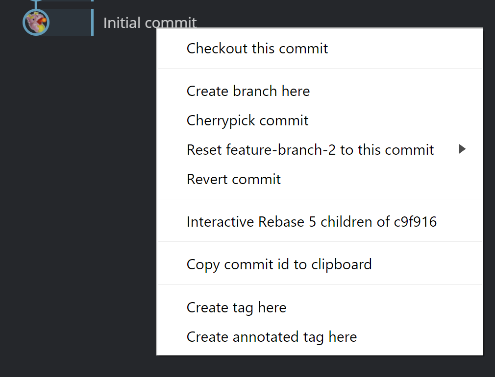 GitKrakenは右クリックすればだいたいのことができるので、おもむろにInitial commitのコミットを右クリックします。