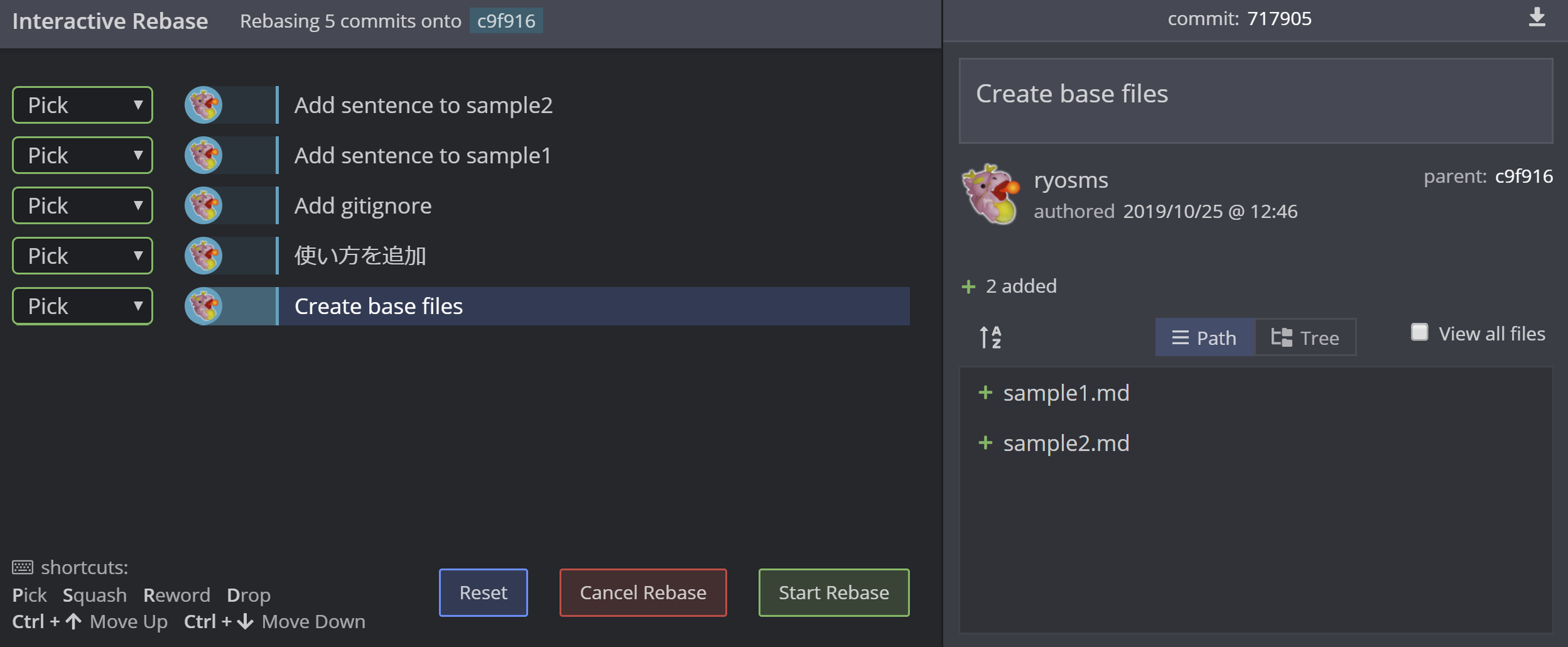 コマンドでrebase -iしたのと似たような見た目ですね。