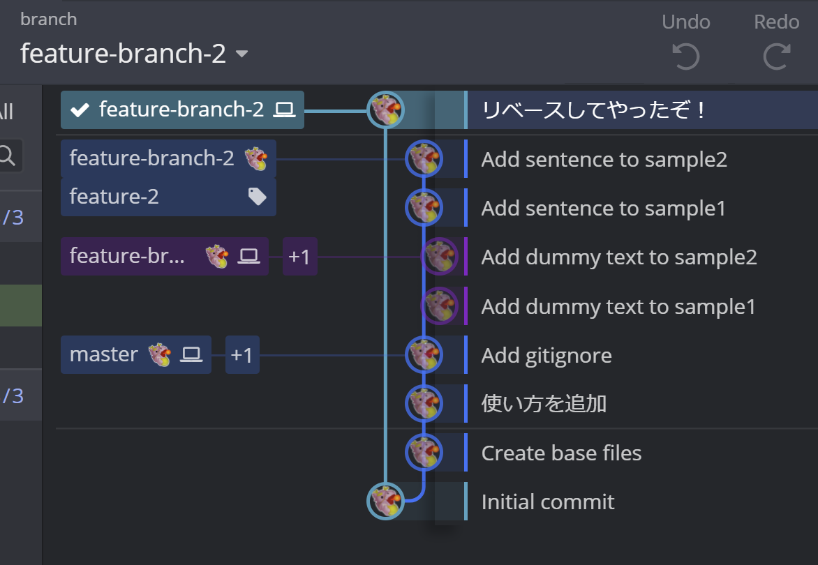 feature-branch-2の最新の状態をInitial commitの次に持ってくるようなちょっと治安の悪いrebaseを行いたいと思います。
