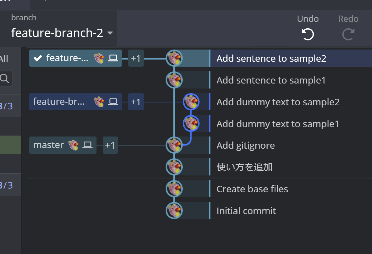 feature-branch-1とfeature-branch-2はどちらもmasterからコミットを重ねた状態ですね。