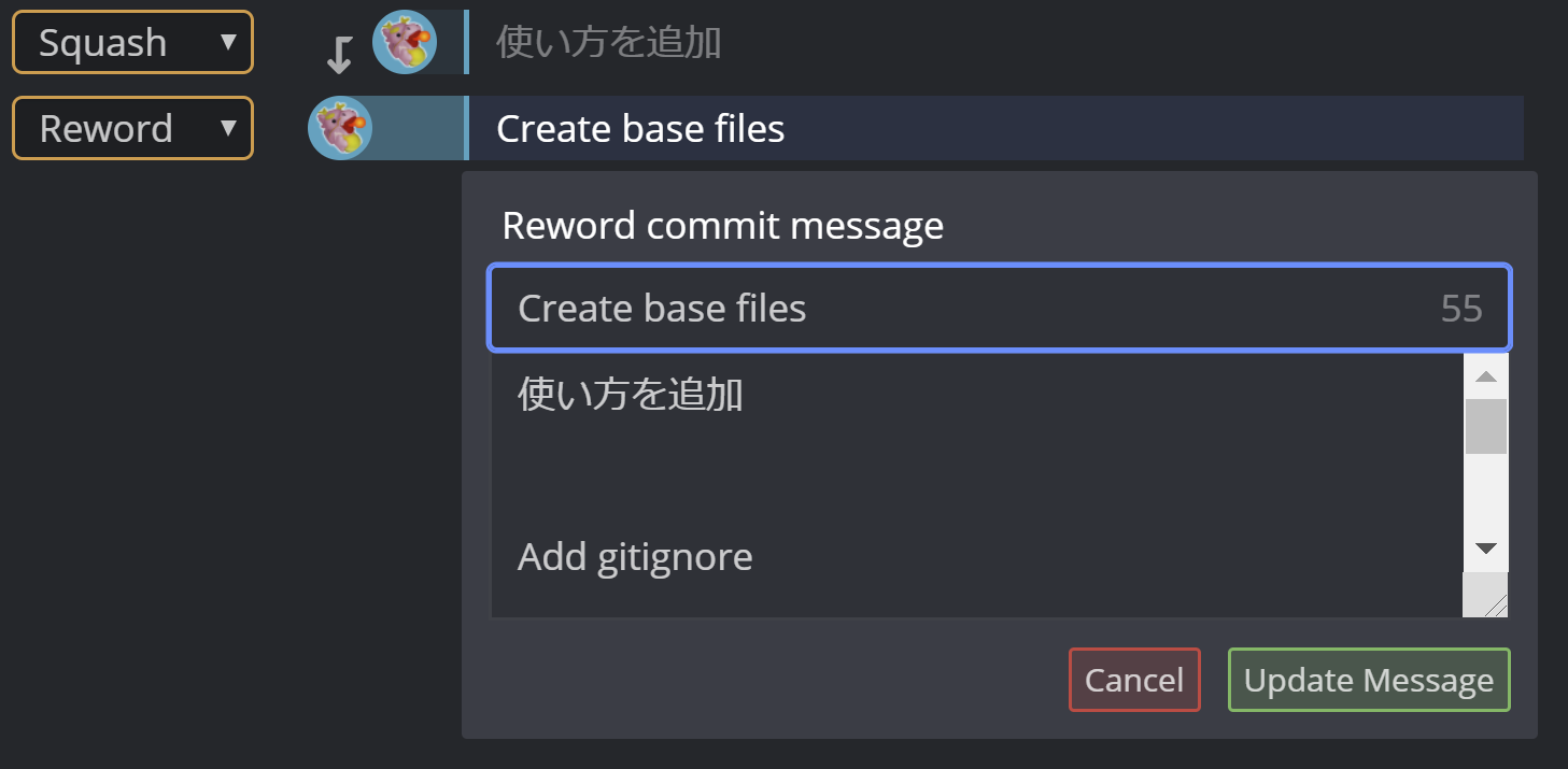 コミットメッセージを編集したい場合は、Rewordのコミット(ここでは「Create base files」のコミット)をダブルクリックします。